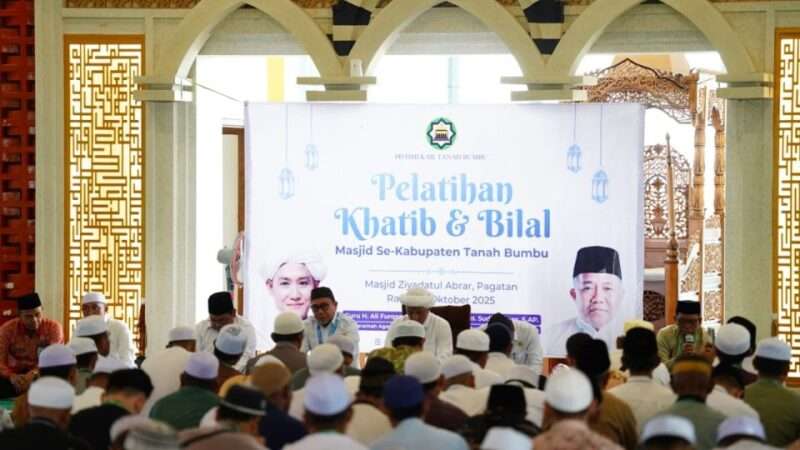 Detikbanua.com, BATULICIN – Bupati Tanah Bumbu Andi Rudi Latif melalui Kabag Kesra Setda Tanah Bumbu, M. Zaki Yamani membuka secara resmi Pendidikan dan Pelatihan (Diklat) Khatib dan Bilal Masjid se-Kabupaten Tanah Bumbu yang di Masjid Agung Ziyadatul Abrar, Pagatan, Kecamatan Kusan Hilir, Rabu (22/10/2025).